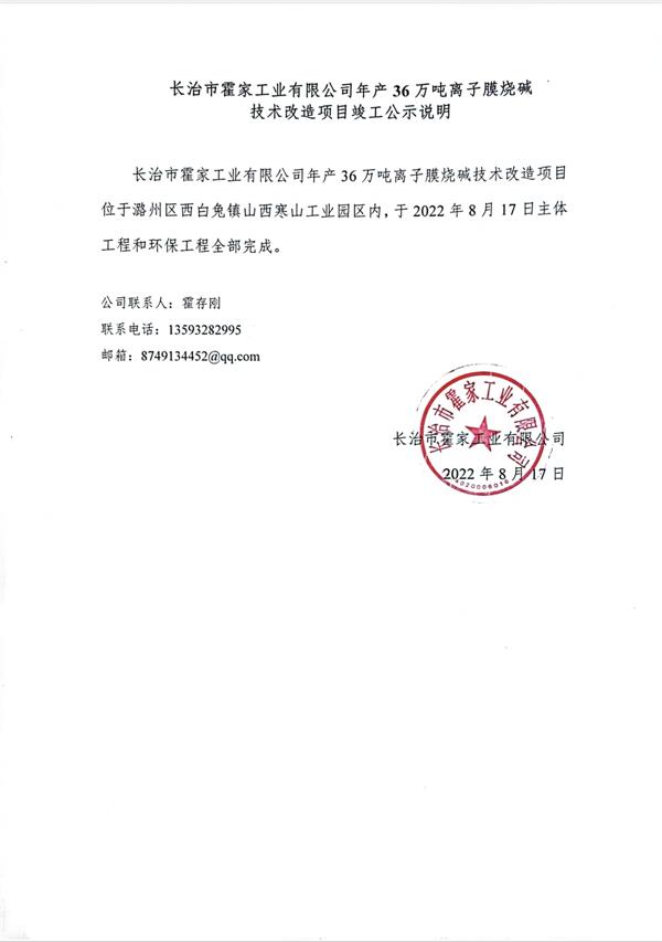 長(cháng)治市霍家工業(yè)有限公司年產(chǎn)36萬(wàn)噸離子膜燒堿技術(shù)改造項目竣工公示說(shuō)明